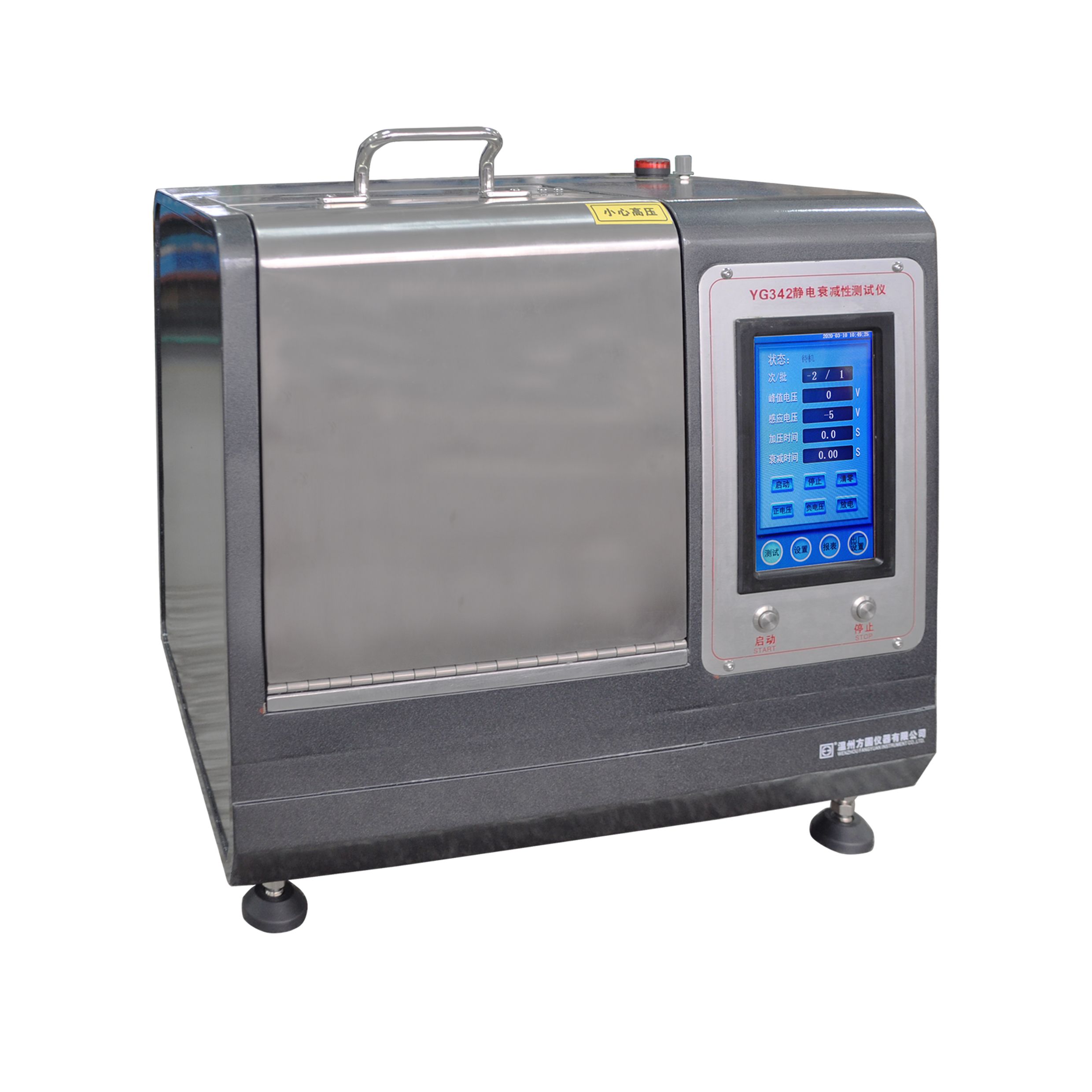 用途:用于測(cè)試醫(yī)用防護(hù)服材料和無紡布在施加±5000V電壓作用后停止充電,在接地的時(shí)候材料能夠消除誘導(dǎo)到材料表面的電荷的能力,即測(cè)定由峰值電壓衰減到10%的靜電衰減時(shí)間。