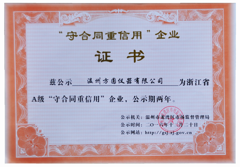 熱烈慶祝溫州方圓儀器有限公司獲得守合同重信譽企業(yè)證書