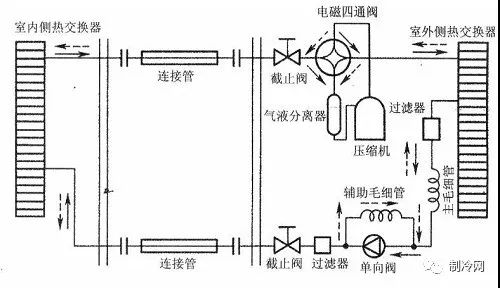 3、熱泵系統 。與單冷系統情況相同,熱泵運行是否正常,主要檢查四通換向閥的工作情況。換向閥換向時,可聽到有比較響的氣體流動聲以及電磁閥頂針的撞擊聲(電磁場吸動閥心),當電磁閥在換向過程中聽不到上述兩種聲音,那電磁閥可能出故障。
